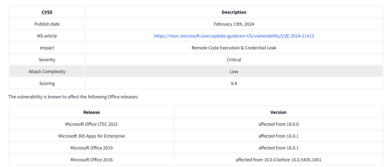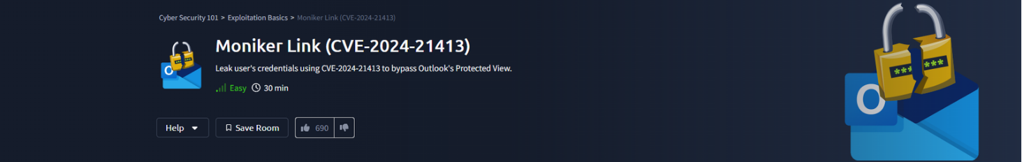 Cette room TryHackMe est centrée sur l’exploitation de la faille critique CVE-2024-21413. Cette vulnérabilité affecte Microsoft Outlook et permet à un attaquant de forcer l’ouverture d’un fichier distant via un lien spécial (moniker), contournant la Protected View. Le but de la room est de comprendre le fonctionnement des monikers, comment les détourner, et de capturer les identifiants de la victime via une attaque SMB.