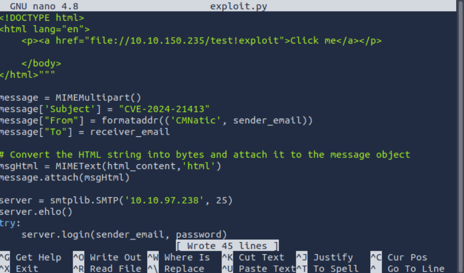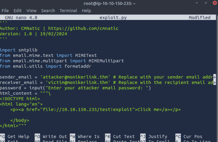 Pour exploiter la faille, un script Python est utilisé pour envoyer un e-mail avec le lien malveillant. Il faut modifier deux éléments :